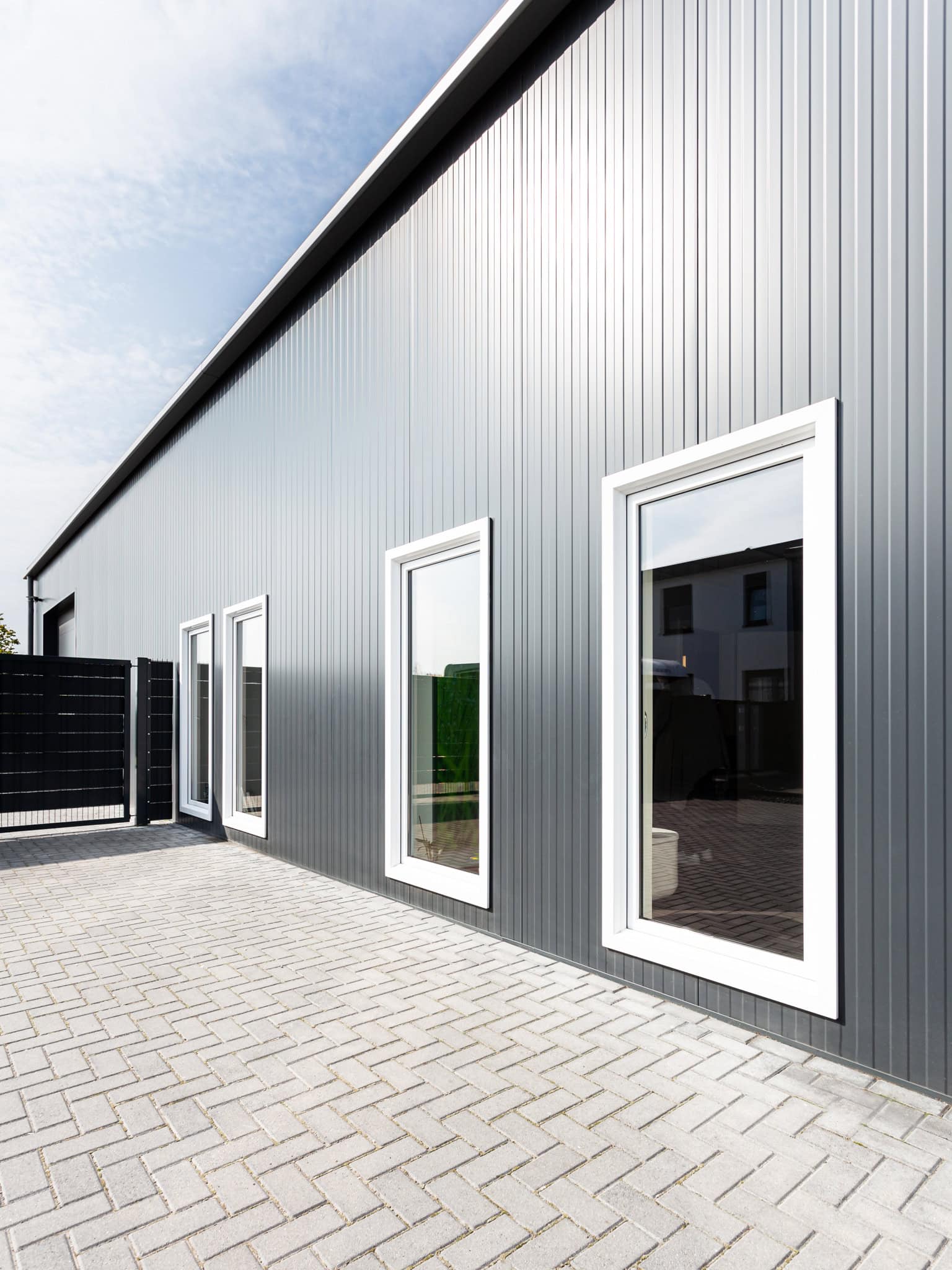 Bei diesem Bauvorhaben wurde besonderer Wert auf eine klare und smarte Optik des Gebäudes gelegt. Die dunkle Fassade in RAL 7016 (Anthrazitgrau) stellt so einen willkommenen Kontrast zu den weißen Kunststofffenstern dar. Die Firmenfarben in Blau und Rot fügen sich ideal ins Gesamtbild ein.