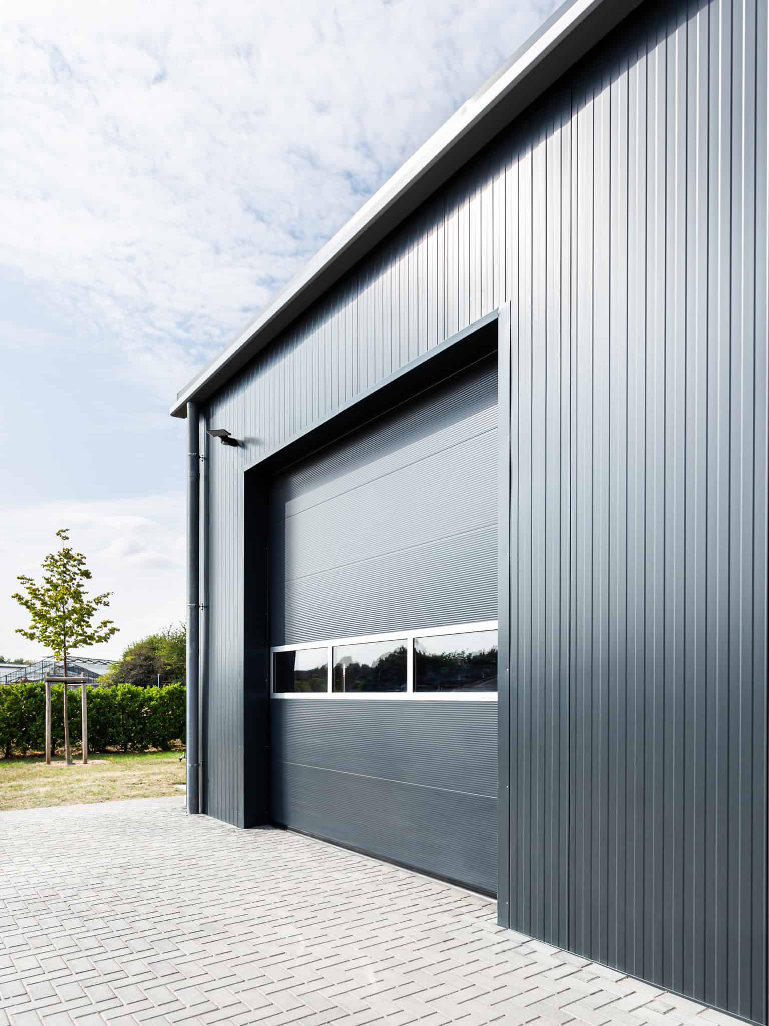 Der hintere Hallenbereich ist zusätzlich mit einem elektrischen PACO-Sektionaltor mit einer Lichtsektion ausgestattet. Die Farbe des Sektionaltores wurde passend zur Fassade in RAL 7016 (Anthrazitgrau) gewählt.