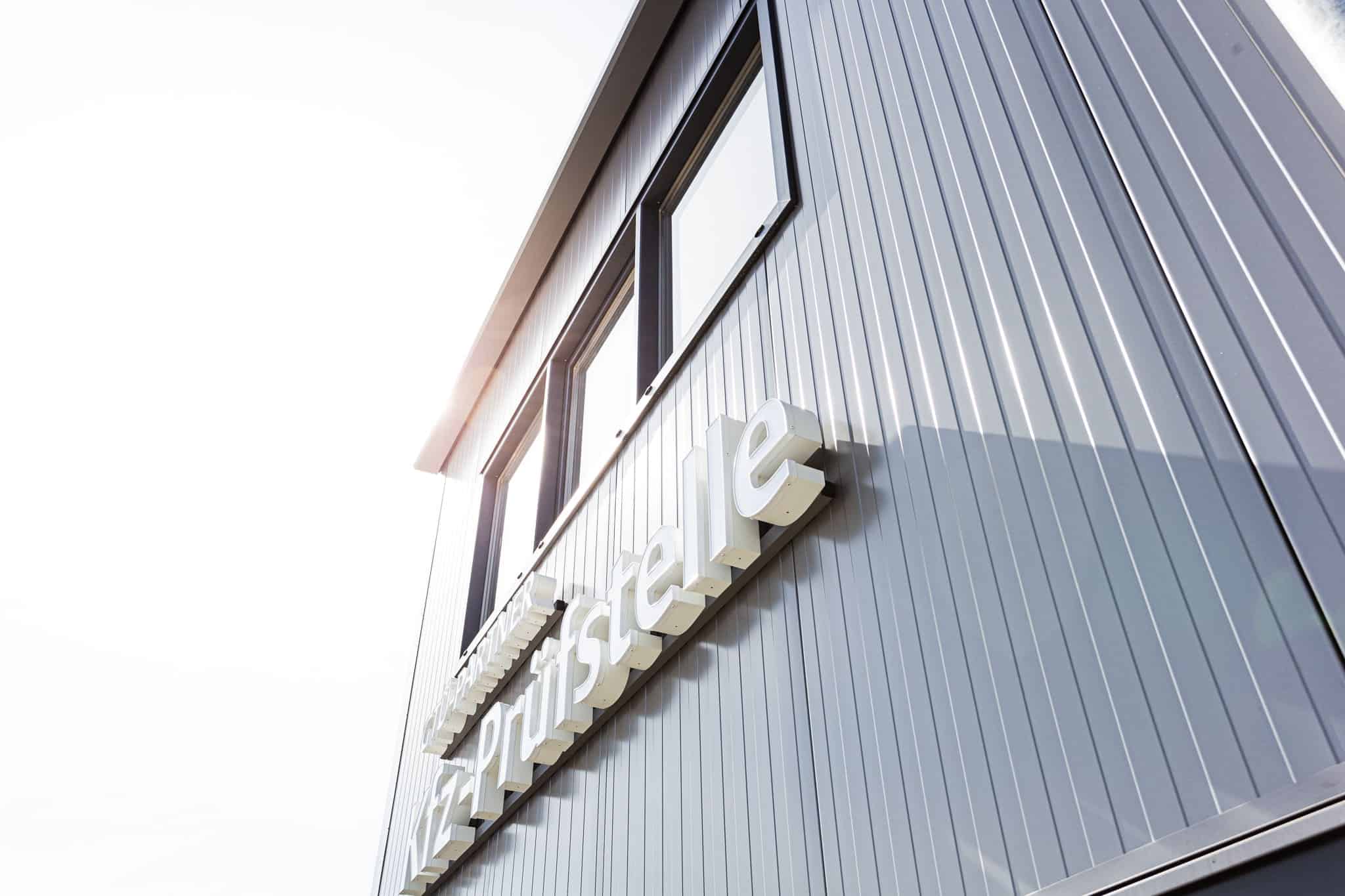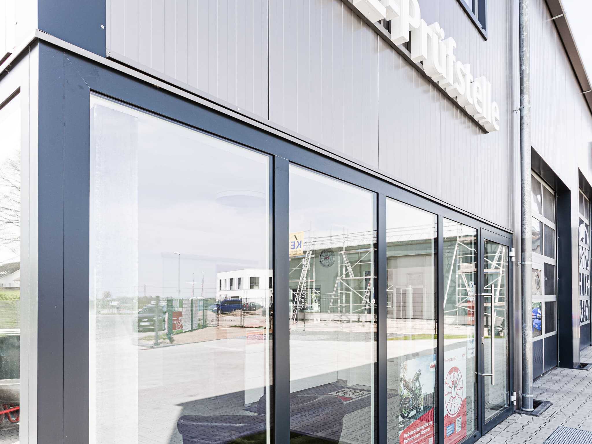 Auf der Rückseite des Gebäudes befindet sich ein zusätzliches Sektionaltor, um eine Durchfahrt des Prüfbereichs zu ermöglichen. So müssen die Fahrzeuge nicht rückwärts aus der Werkstatthalle herausfahren, sondern können bequem aus dem Prüfstand gelangen.
