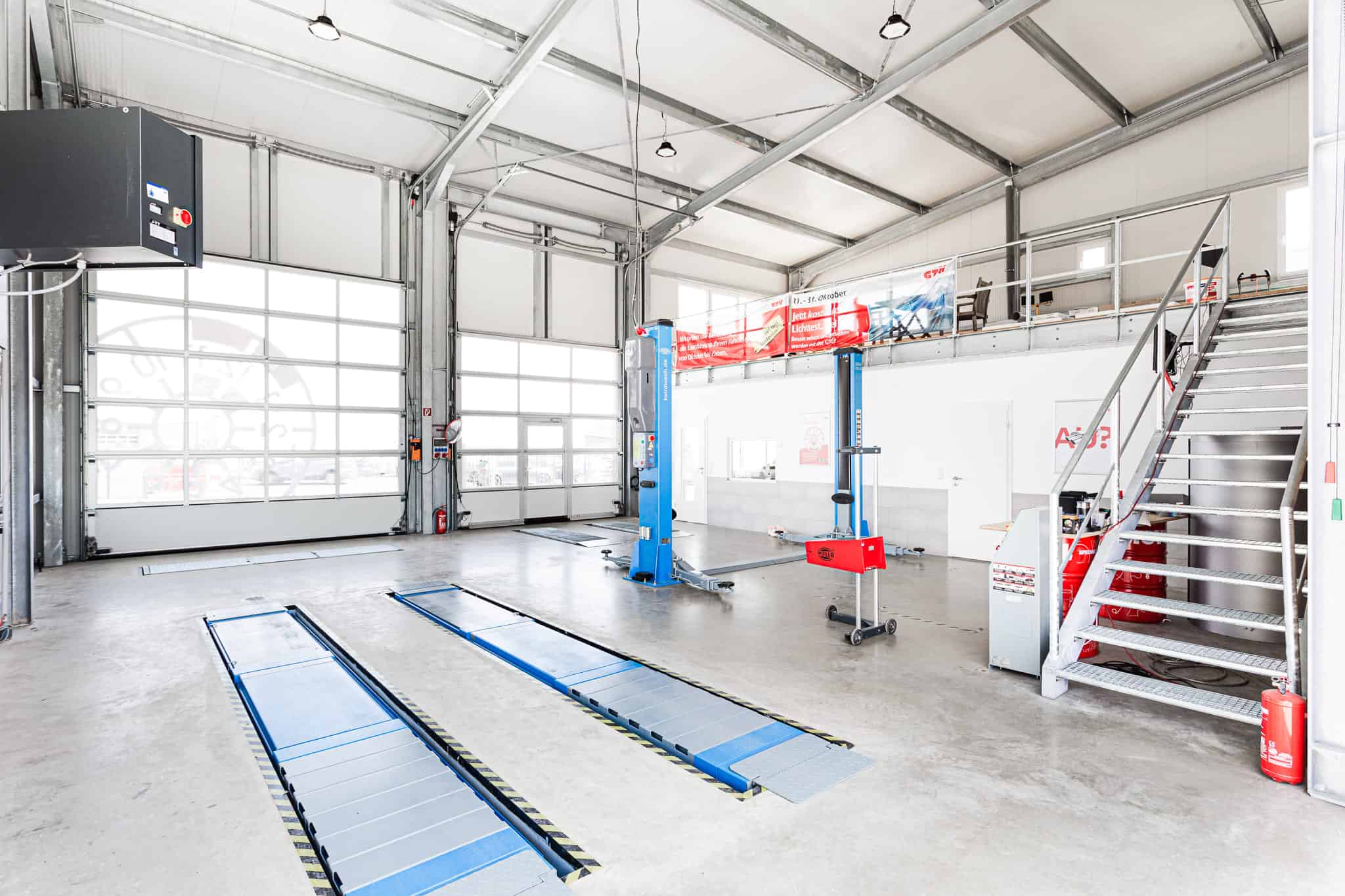 Im Halleninneren wurden durch unser Partnerunternehmen Futura Prüfstände und Scherenbühnen in der Bodenplatte integriert, die für die tägliche Wartung und Überprüfung der Fahrzeuge notwendig sind. Sodass die Werkstatthalle für den täglichen KFZ-Betrieb funktionsfähig wird.