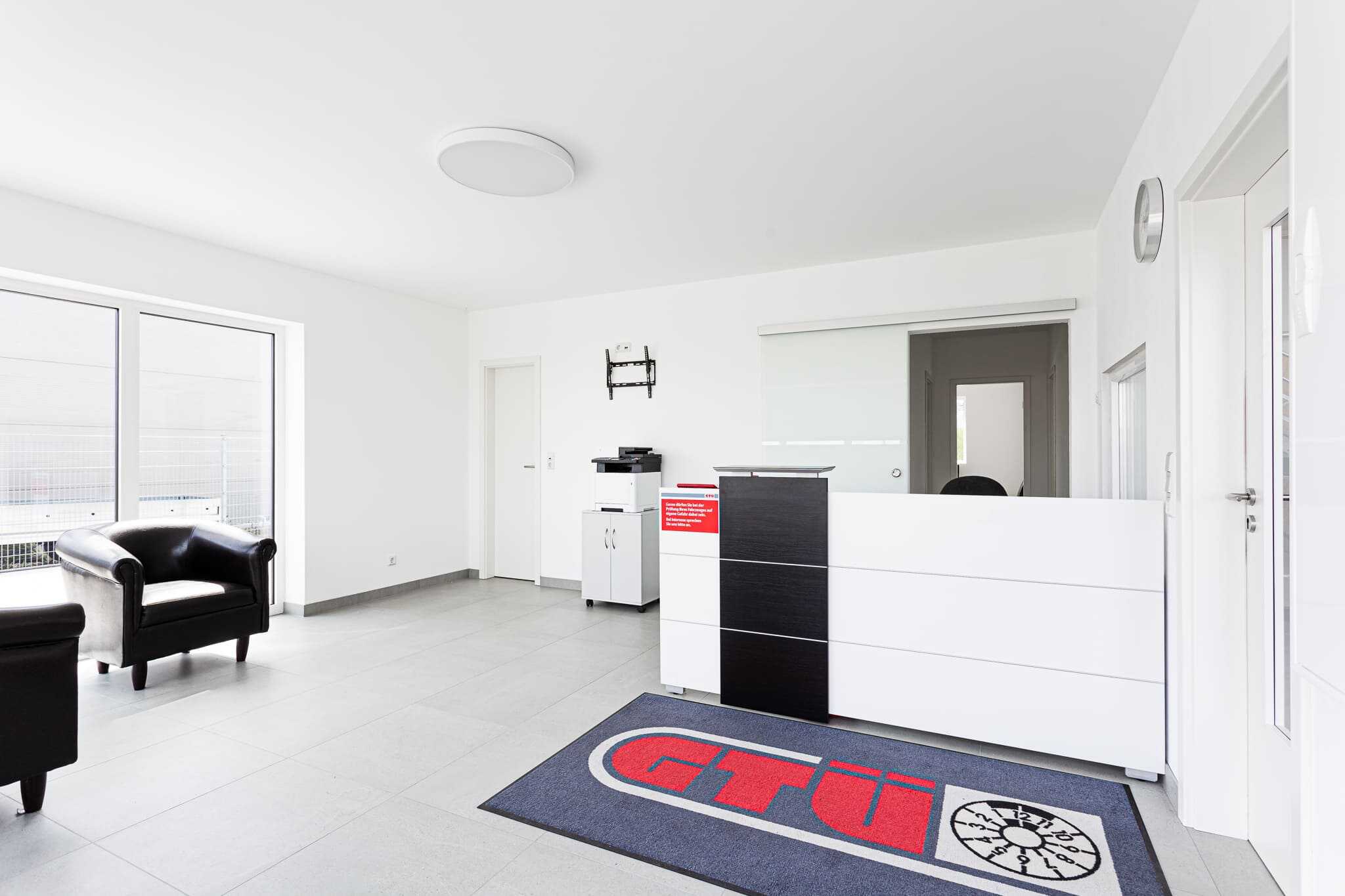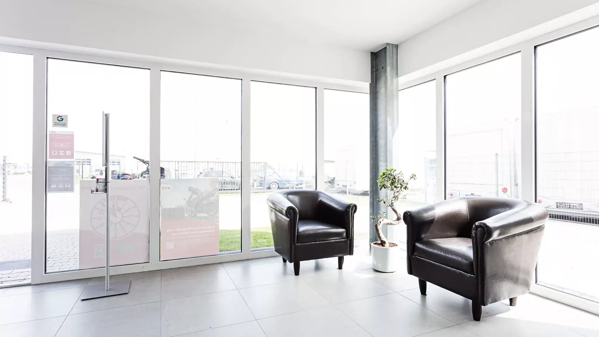 Der Empfangsbereich wurde unterhalb der Lagerbühne vom Bauherren in Trockenbauweise errichtet und bietet den Kunden einen professionellen Empfang abseits der Werkstatt. Die Über-Eck-Glasfassade vergrößert den Empfangsbereich optisch auf ein Maximum und sorgt für einen freundlichen und hellen Warteraum für alle Kunden.
