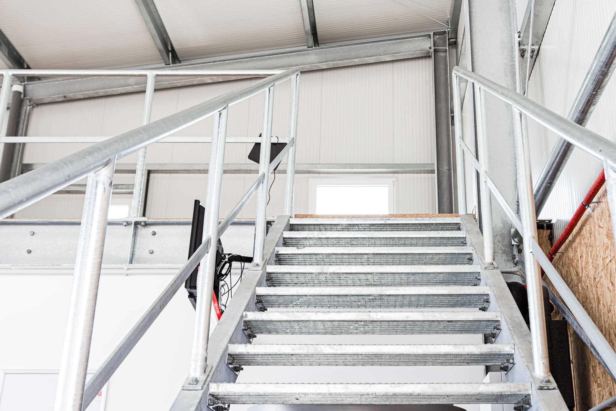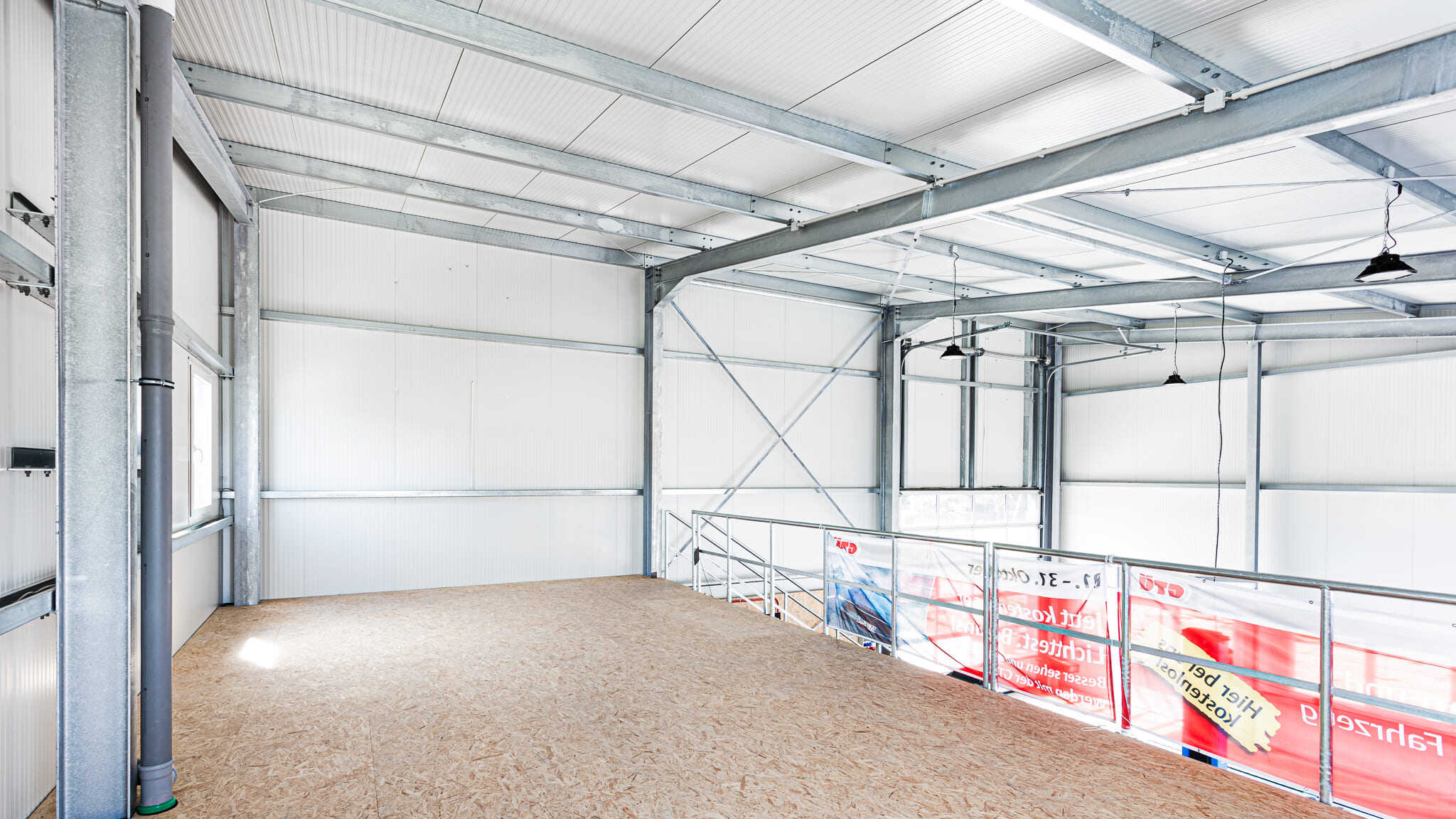 Umgesetzt wurde eine Werkstatthalle für einen KFZ-Betrieb. Entsprechend wurde das Gebäude funktional mit einer 60 m² Lagerbühne im Halleninneren ergänzt. Darunter wurde vom Bauherren ein Innenausbau eingesetzt. Zudem statteten wir die KFZ-Fertighalle mit drei Sektionaltoren mit großzügiger Verglasung sowie diversen Fensterelementen in Kunststoff und Aluminium aus. Eine rundum funktionale und hochwertige KFZ-Prüfstelle wurde so realisiert!