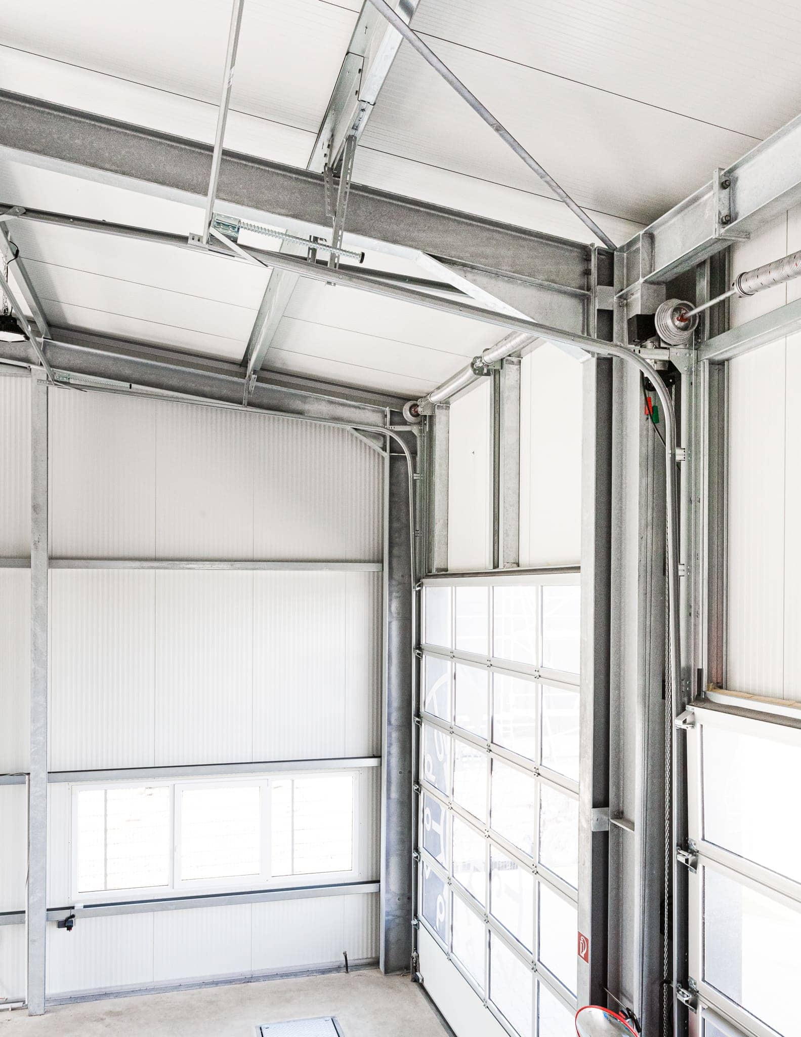 Der Arbeitsbereich ist durch die großen, komplett verglasten Sektionaltore besonders hell. Die Sektionaltore der KFZ-Fertighalle wurden alle platzsparend in Dachfolge verbaut, sodass die Hallenhöhe optimal ausgenutzt werden kann.