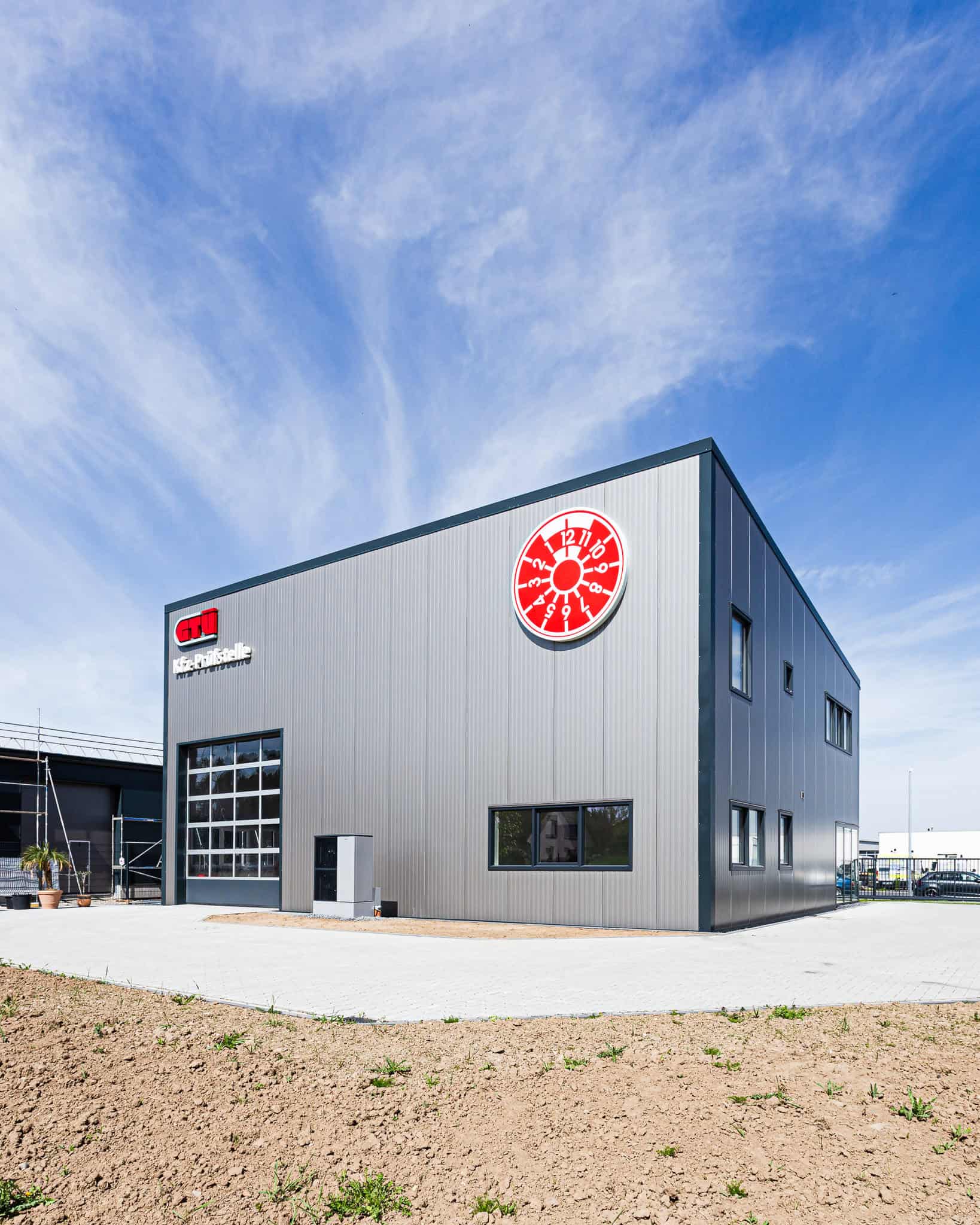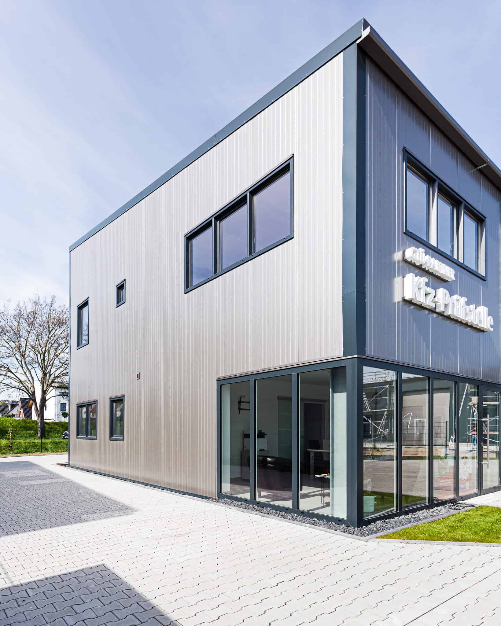 Diese PACO-Systemhalle wurde für eine KFZ-Prüfstelle eines GTÜ Vertragspartners in 53332 Bornheim errichtet. Um eine ausreichende Wärmedämmung zu schaffen, wurden 100 mm ISO-Paneele im Dach- und Wandbereich eingesetzt. Farblich wurde die Dach- und Wandverkleidung in RAL 9007 (Graualuminium), die Gebäudeecken sowie die übrigen Kantteile in RAL 7016 (Anthrazitgrau) ausgeführt.