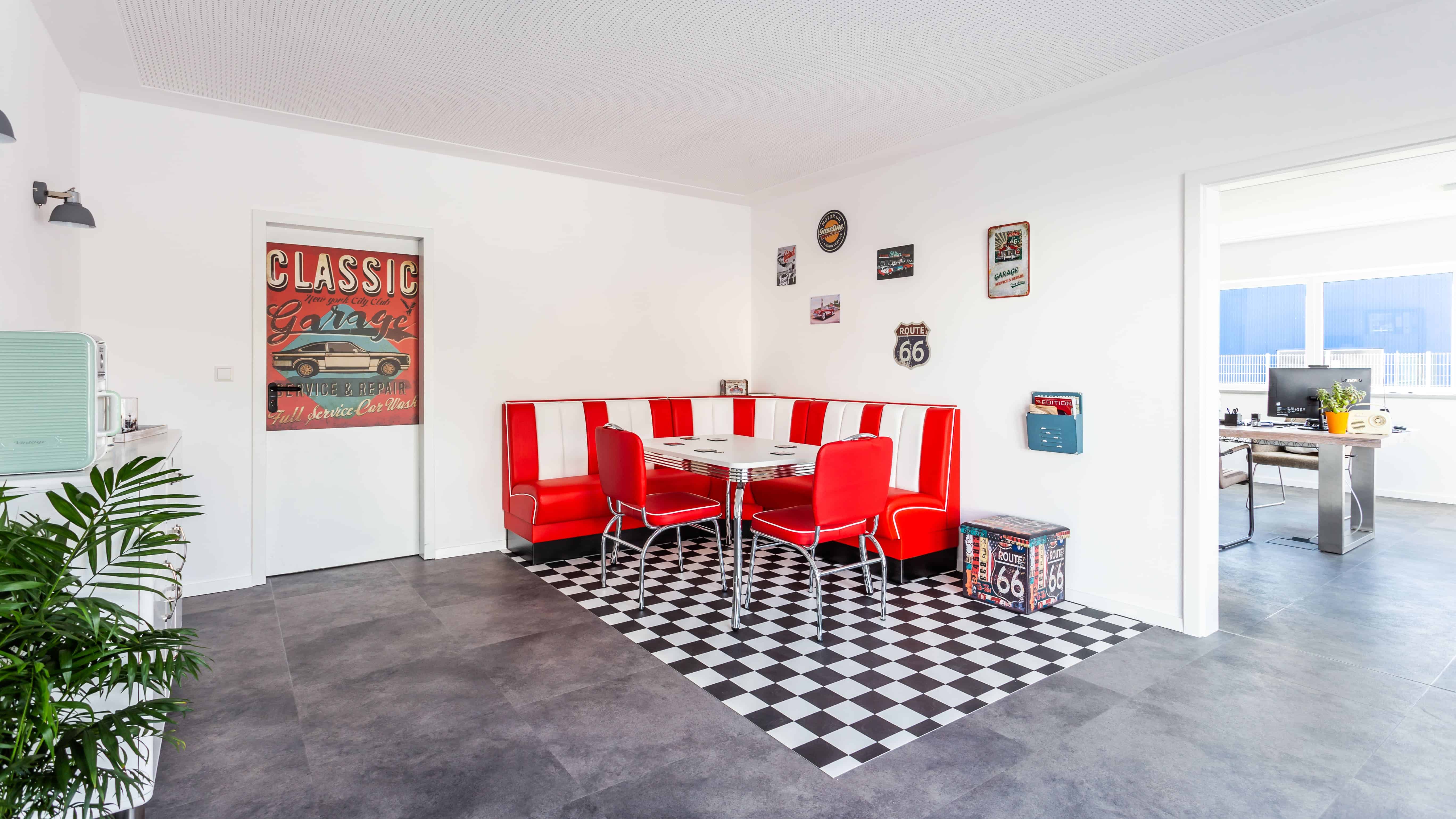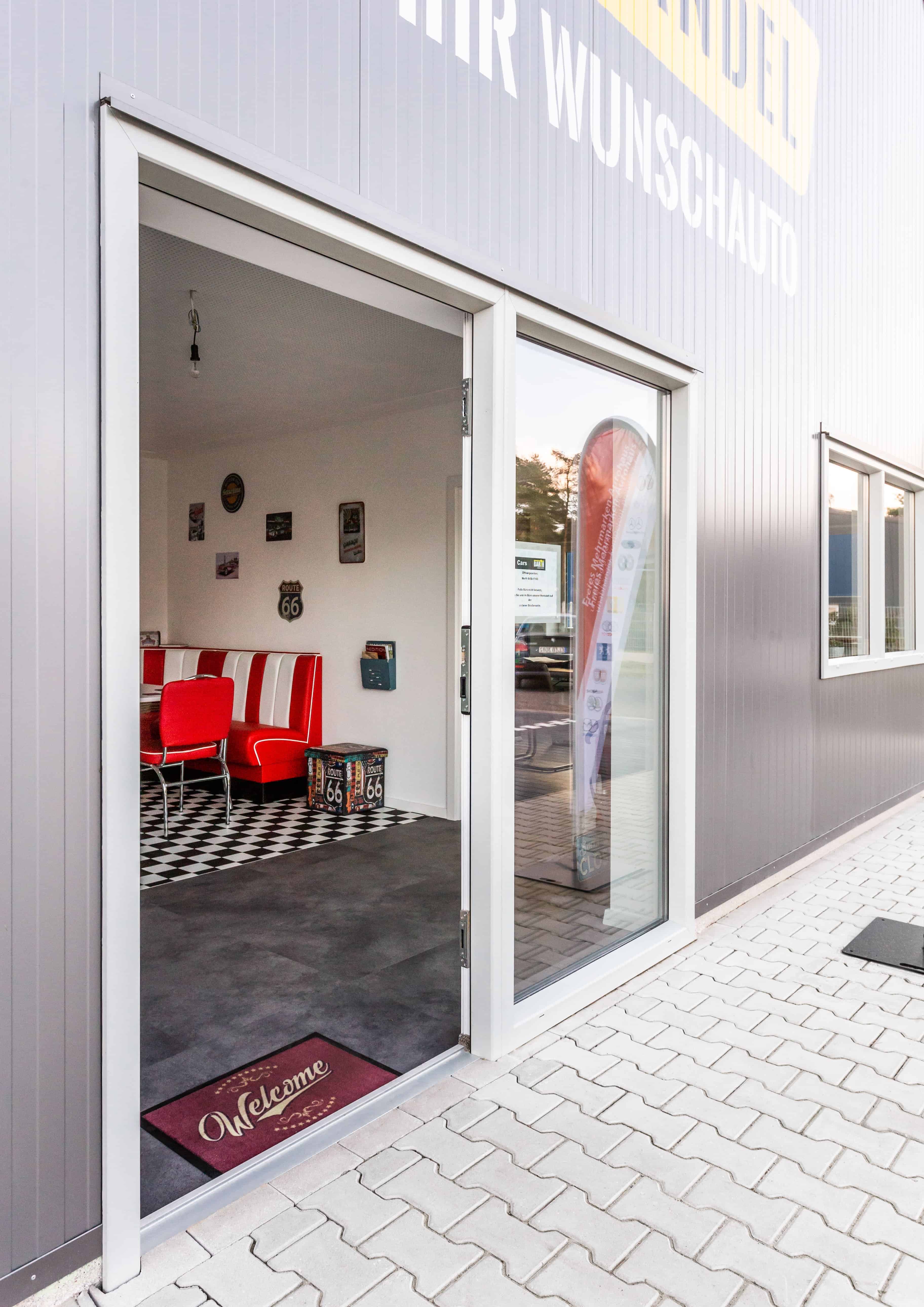 Der Gesamteindruck dieser Hallenplanung lässt sich sehen! Schlicht und funktional können um die Halle herum nun aufbereitete Fahrzeuge für die Ausstellung arrangiert werden. Kunden und Mitarbeiter können die ansprechend ausgebauten Räumlichkeiten nutzen.