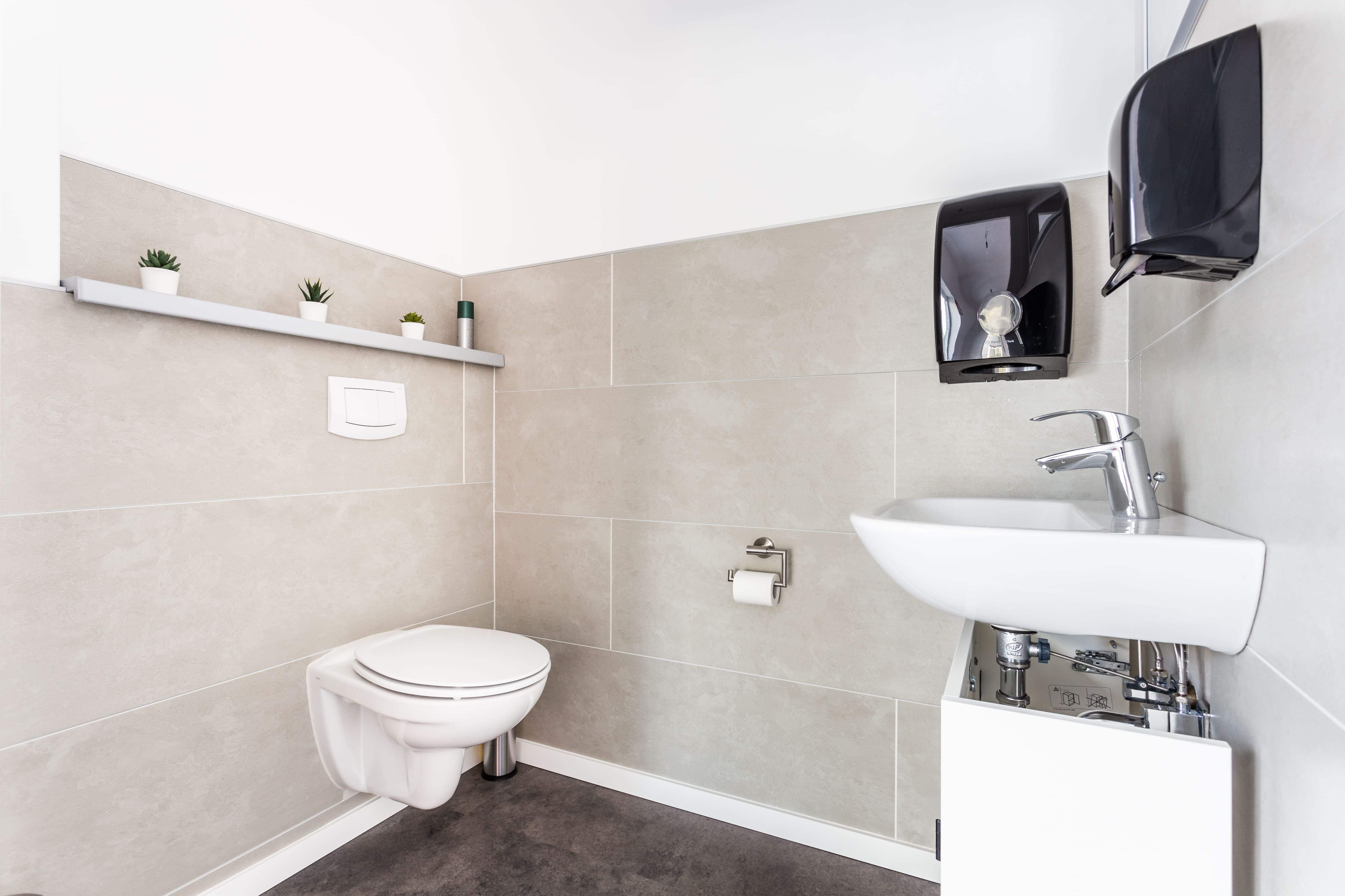 Unerlässlich sind die Sanitäreinrichtungen in einer Systemhalle. Zumindest ein WC sollte immer verfügbar sein und lässt sich im PACO-Innenausbau perfekt einsetzten.