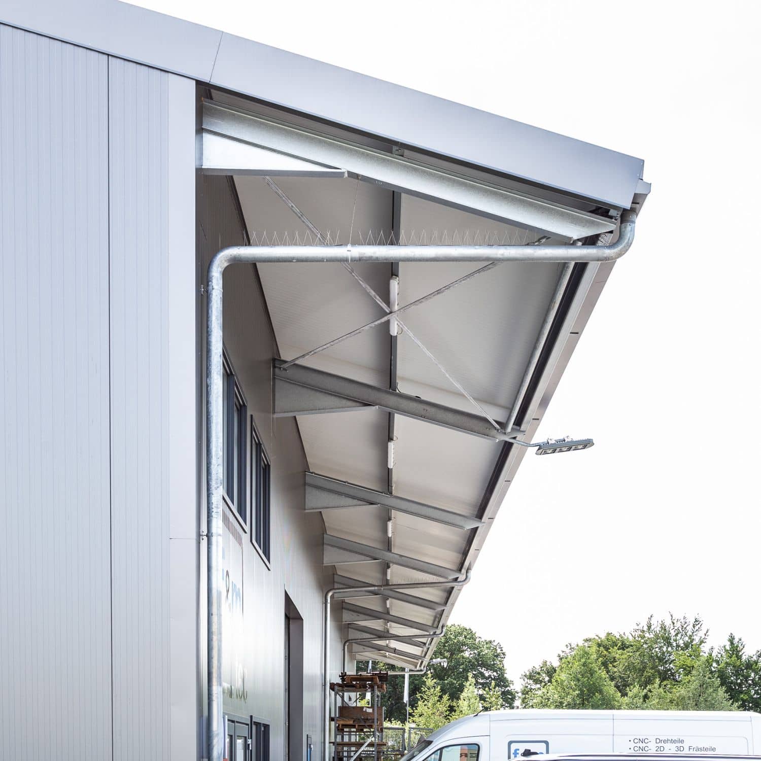 Die PACO Produktionshalle mit Büro wurde mit einem Kragarm ausgestattet. Dieser hat eine Breite von 3,50 m und bietet dem Kunden eine zusätzliche Fläche für eine geschützte Unterstellung oder kann als Lagerüberdachung genutzt werden. Der Kragarm besteht aus einem ISO-Paneele in der Stärke 100 mm und verläuft in Dachfolge.