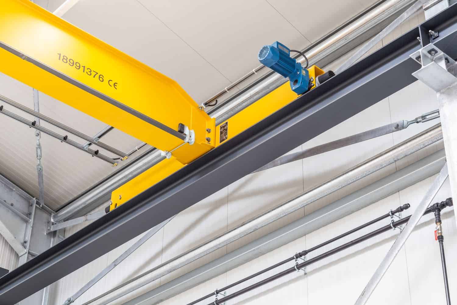 Zudem wurde die statische Ertüchtigung der Hallenkonstruktion zur Aufnahme eines Hallenkranes berücksichtigt. Die Knaggen der Hallenkonstruktion dienen so als Auflagefläche für die Kranbahn, auf der sich nun der Hallenkran flexibel über die gesamte Hallenfläche bewegen kann. Die freitragende Hallenkonstruktion sorgt zudem für einen offenen Arbeitsbereich ohne störende Stützen im Halleninneren.