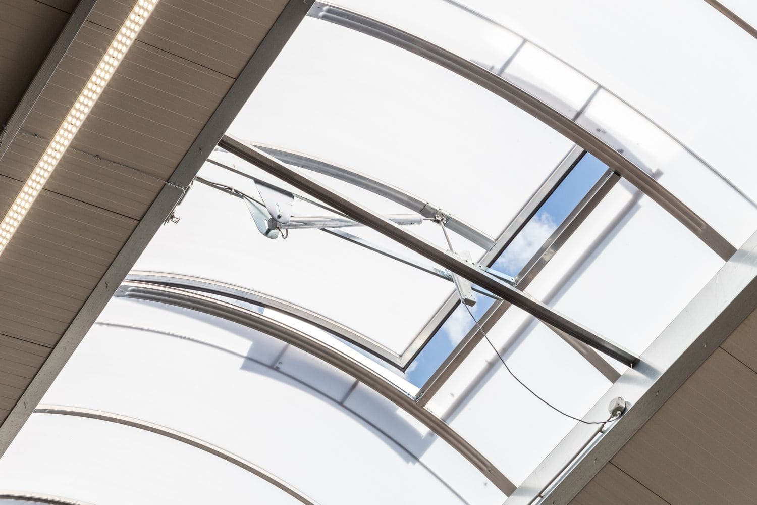 Die innerhalb des Lichtfirstes installierte Lichtbandklappe dient der kontrollierten Belüftung der Halle. Die Öffnung erfolgt über eine elektrische Steuerungseinheit, die per Schalter bequem zu bedienen ist.