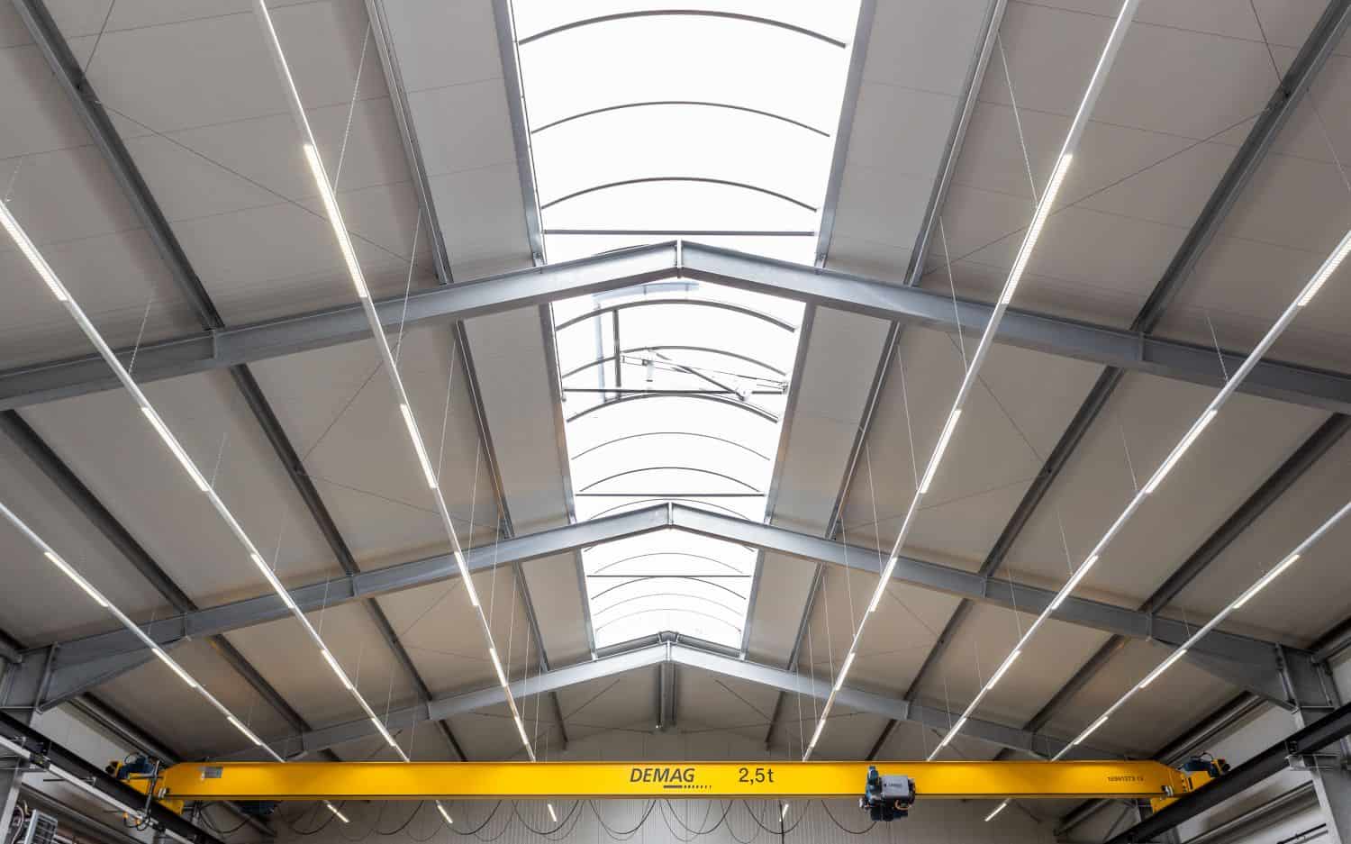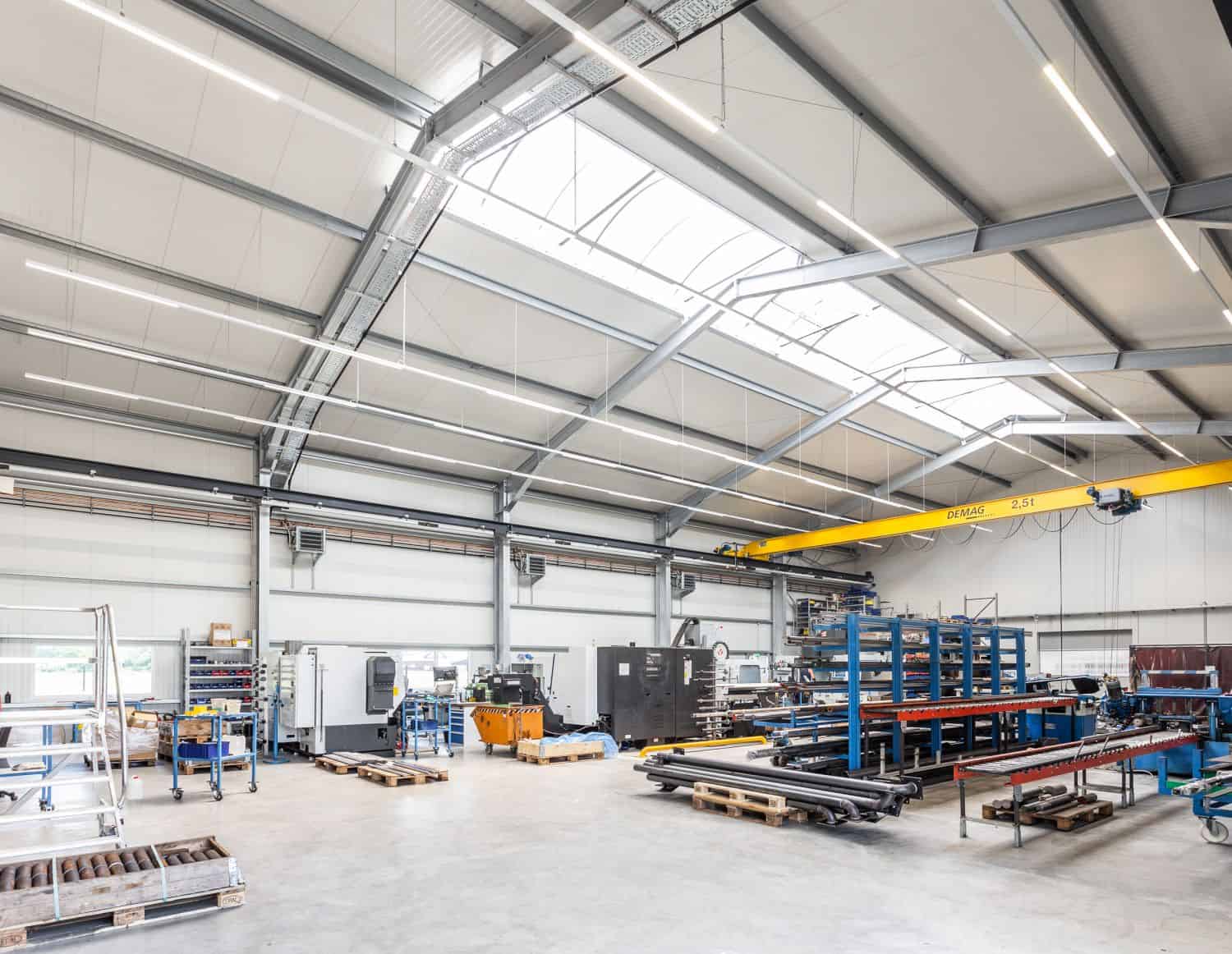 Der verbaute Lichtfirst erstreckt sich auf eine Länge von 18,00 m und sorgt für eine effektive Ausleuchtung der Produktionshalle. So kann der Einsatz elektrischer Beleuchtung reduziert werden. Der großzügige Lichtfirst macht die Halle auch optisch zu einem Highlight.