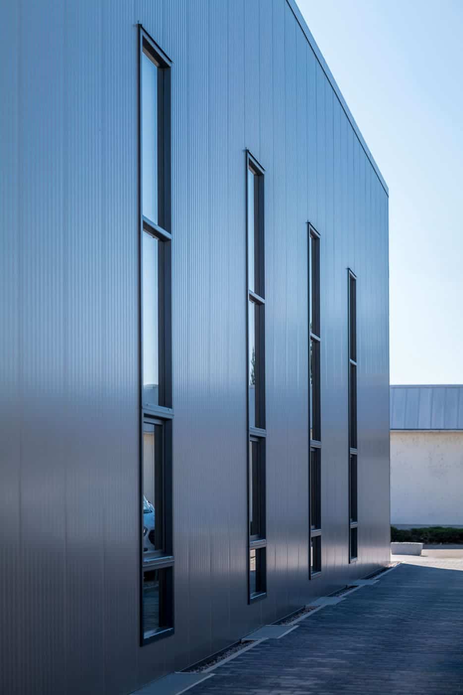 Die Halle fasziniert durch ihre großzügige Glasfassade im Eingangsbereich. Diese Aluminium Pfosten-Riegelkonstruktion ist nicht vergleichbar mit dem normalen Einbau von Fenstern und setzt somit ein optisches Highlight in diesem Gebäude. Zu der Glasfront wurden noch diverse Aluminium-Fenster und Kunststoff-Fenster in RAL 7016 (anthrazitgrau) sowie Aluminium-Mehrzwecktüren verbaut. Die Verkleidung der PACO-Systemhalle als Pultdachvariante erscheint in einem passenden RAL 9007 (graualuminium).