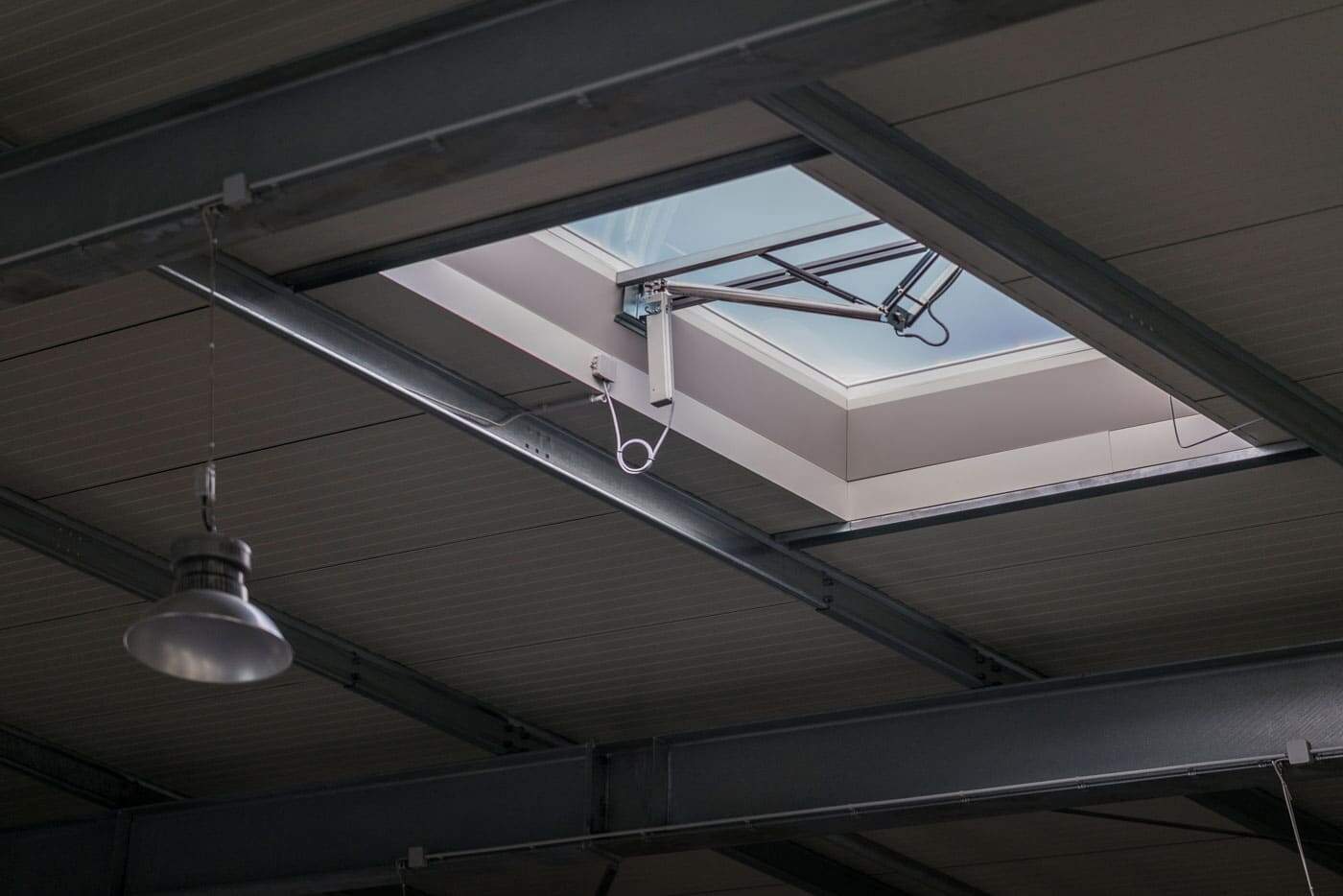 Für die tägliche Ent- und Belüftung kann die PACO-Lichtkuppel im Dachbereich manuell gesteuert werden. Darüber hinaus ist diese mit einer Rauch- und Wärmeabzugsanlage ausgestattet. Der verbaute Notauslösekasten gewährleistet im Brandfall eine sekundenschnelle Öffnung der Kuppel, um für einen sofortigen Rauchabzug zu sorgen.