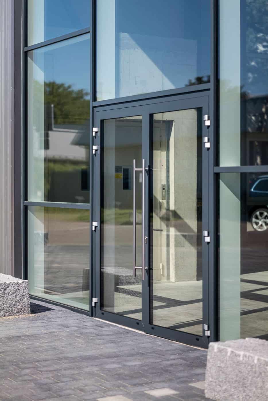 Die Glasfassade hat eine Größe von 8,00 x 5,50 m (BxL) und bietet so einen imposanten Eingangsbereich. Dabei wurde eine hochwertige Aluminiumkonstruktion in Pfosten-Riegelbauweise eingesetzt.