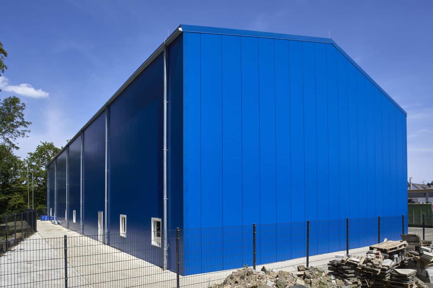 Für einen einheitliches Aussehen sorgen die farblich passend zur Außenwand verbauten Sektionaltore in RAL 5010 (enzianblau). Den Wunsch des Kunden von einer lichtdurchfluteten Halle wurde mittels eines großen Lichtfirsts sowie durch mehrere eingebauten PACO Kunststofffenster erfüllt. Die beiden PACO Mehrzwecktüren verschaffen mehrere Zugänge zum Halleninneren.